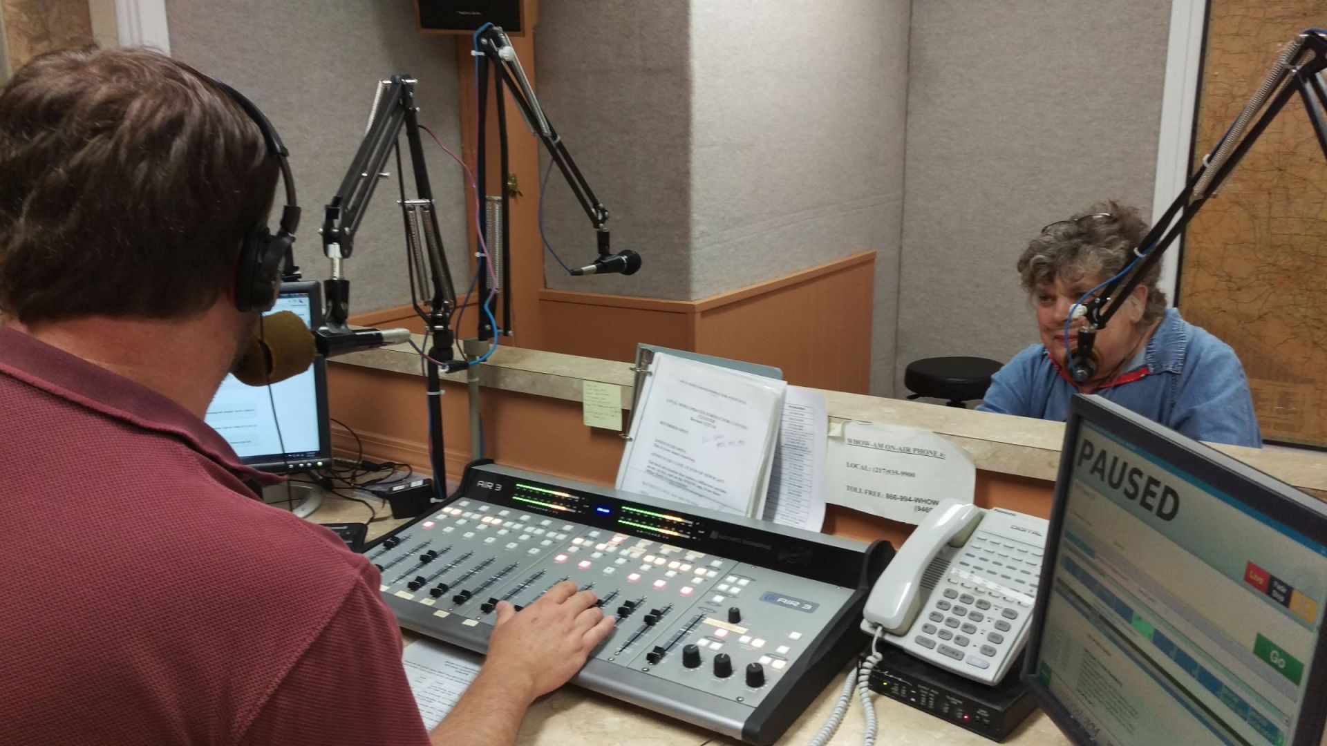 WHOW engineer and former on-air announcer Wayne R. Miller visiting with Bobbi Perryman of the Warner Public Library. Miller and WHOW presented Perryman original documents from WHOW's coverage of the 1968 Clinton tornado. Even though WHOW-AM 1520 is licensed as a daytime AM station, it stayed on the air all night giving emergency information.