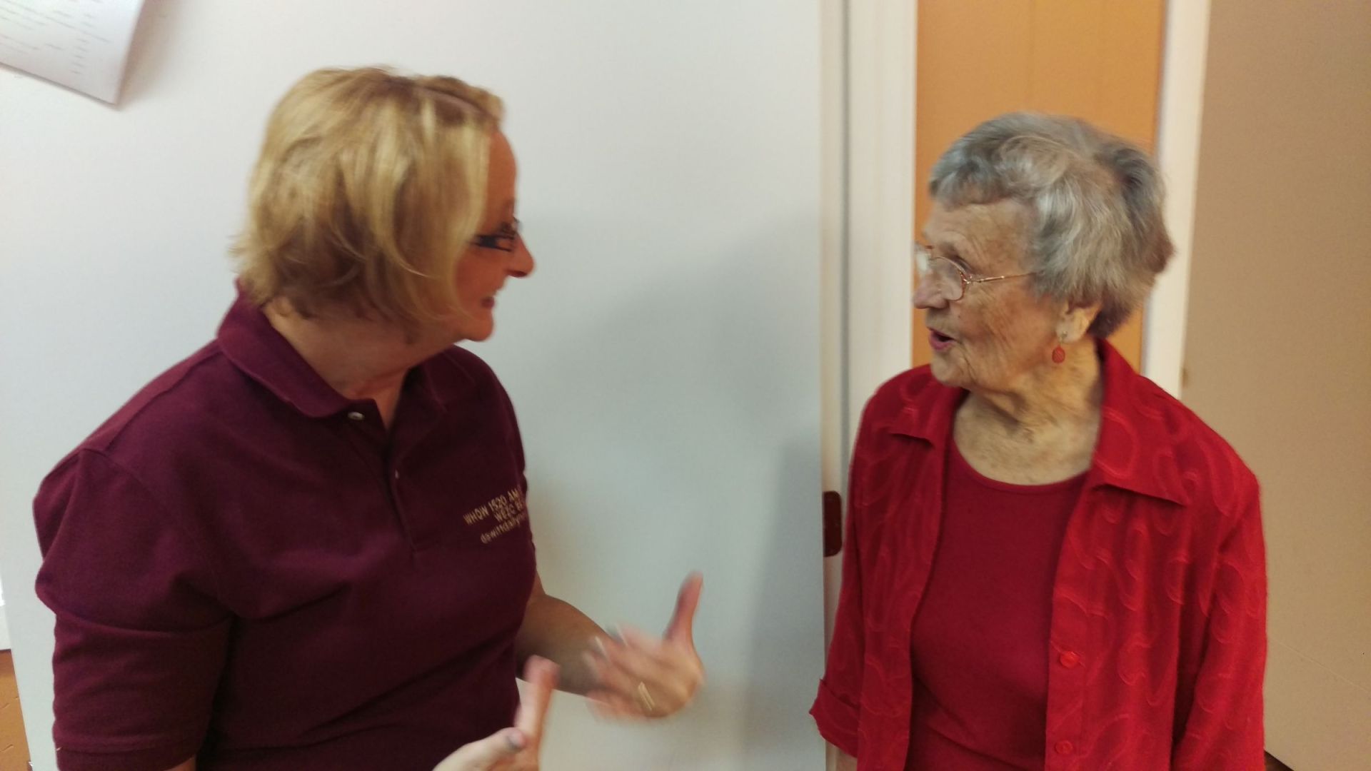 WHOW co-owner Cathy Miller (left) visiting with a long-time listener.