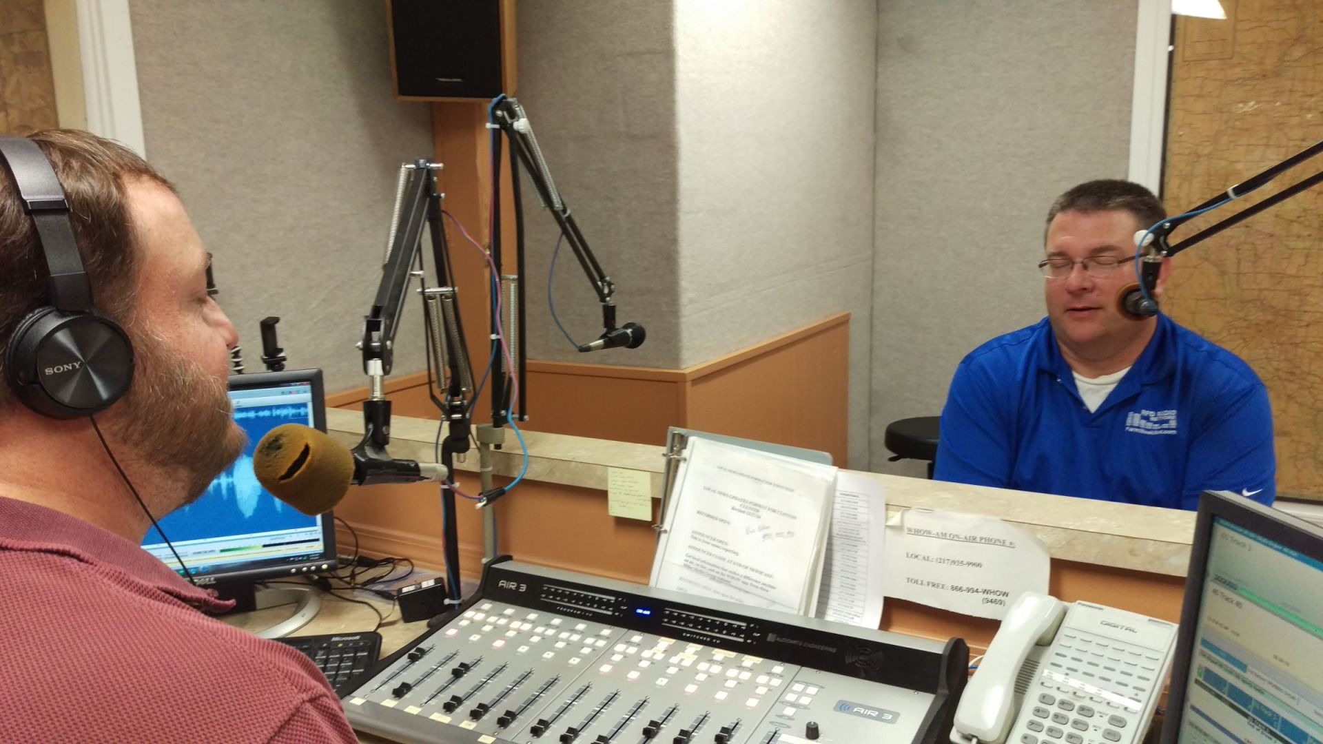 WHOW's Jared White (left) visiting with DeLoss Jahnke of the RFD Radio Network. WHOW was a charter affiliate of the RFD Radio Network when the network signed on in 1966.
