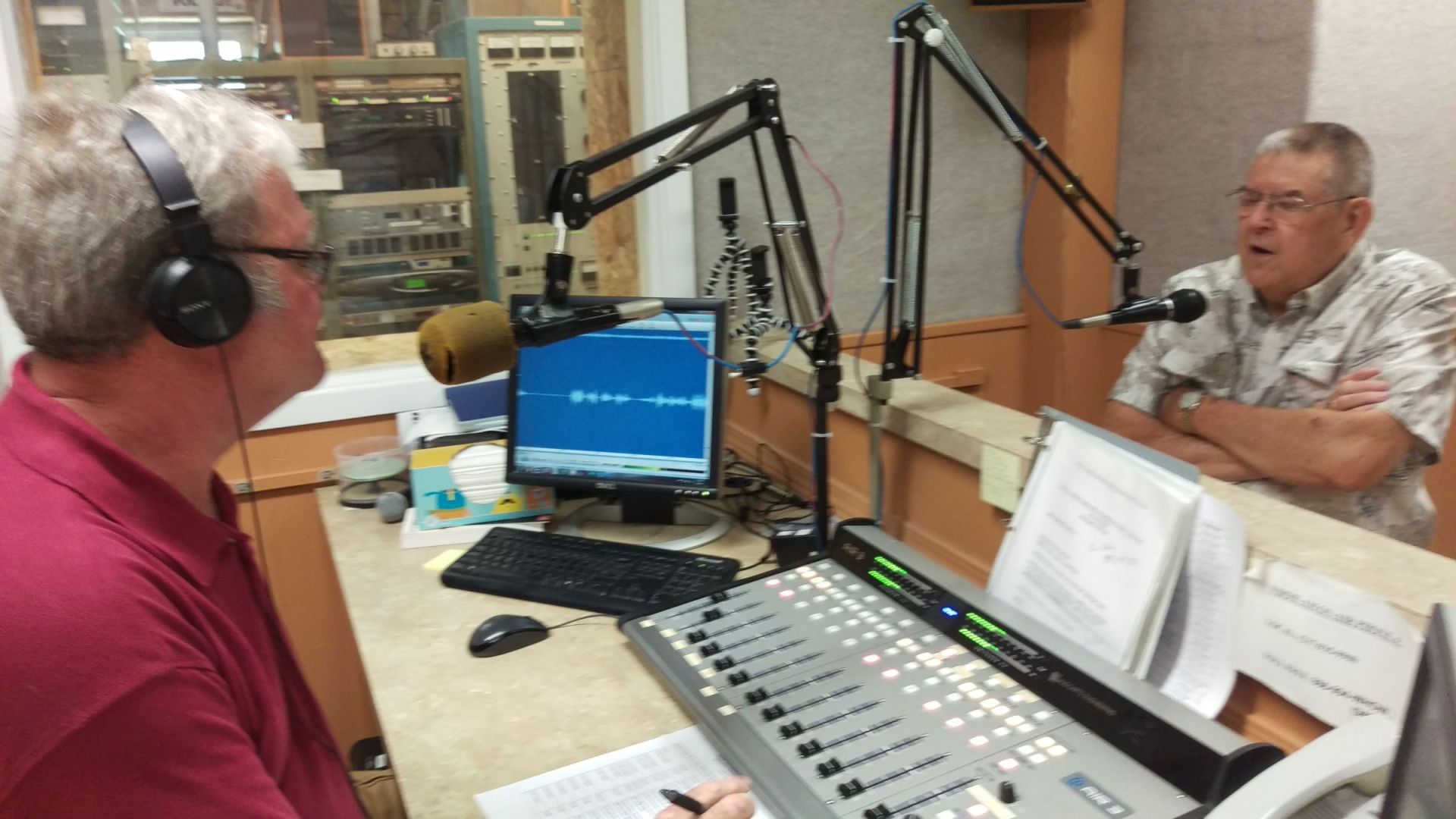 WHOW engineer and former on-air announcer Wayne R. Miller (left) visited with Glenn Spain, former member of a country western band performed on WHOW in the late 50s and early 60s.